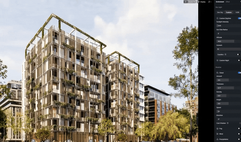 Lighting plays a key role in shaping the mood of your exterior renderings. A powerful method is using an HDRI skycombined with a custom sun tool in D5 Render. This lets you precisely control intensity, shadow softness, and highlights placement, creating a more dynamic and realistic lighting setup. Proper lighting can instantly elevate the overall quality of your render.