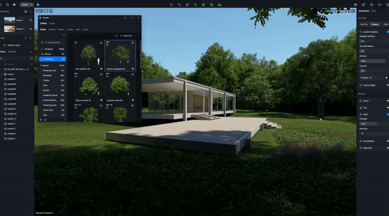 レバレッジ D5 レンダリングの豊富なビルトインプラントモデルライブラリにより、環境設定や雰囲気の設定ができます。