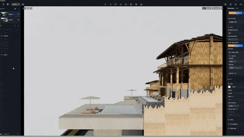 A single click aligns atmosphere with your reference image. D5 adjusts sun angle, haze, fog, and environment to that mood in seconds—perfect when the composition is right but the feeling isn’t. Iterate until the atmosphere feels true.