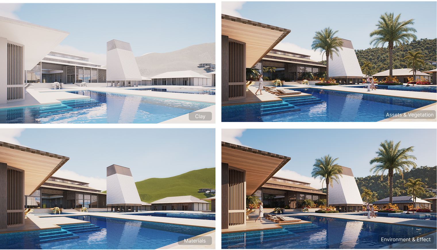 For a coastal masterplan, these adjustments are not cosmetic. Water, sky, and vegetation define experiential quality and competitive positioning.