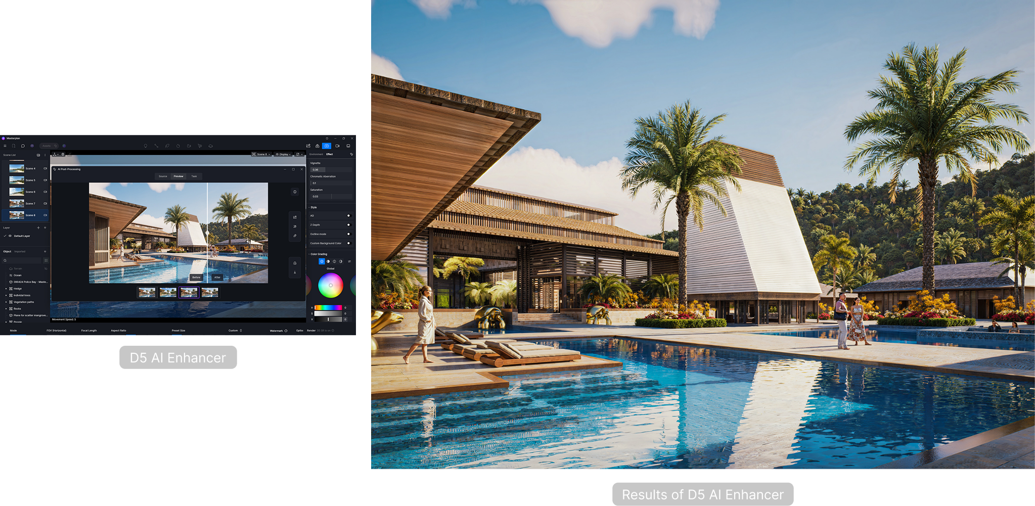 On projects such as the major tropical resorts—set across steep terrain and dense tropical vegetation—environmental credibility was critical. Using D5’s vegetation library and scatter tools, the team populated complex topography efficiently while maintaining variation. The improved ocean settings strengthened marina and beachfront views, allowing water to read as integrated rather than composited.