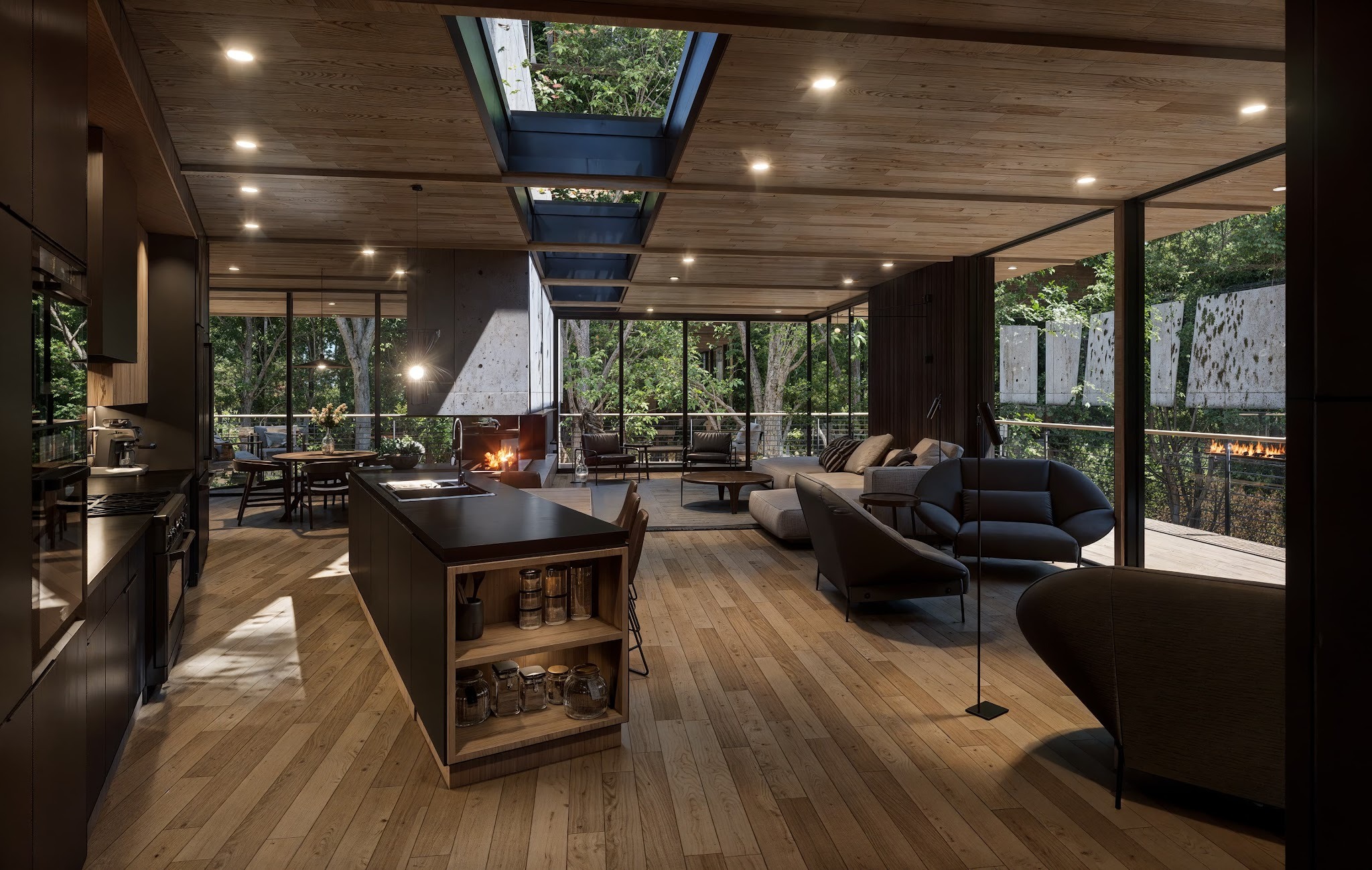 Compression gives way to release. Light enters from above, views extend through the trees, and the landscape continues through the house.