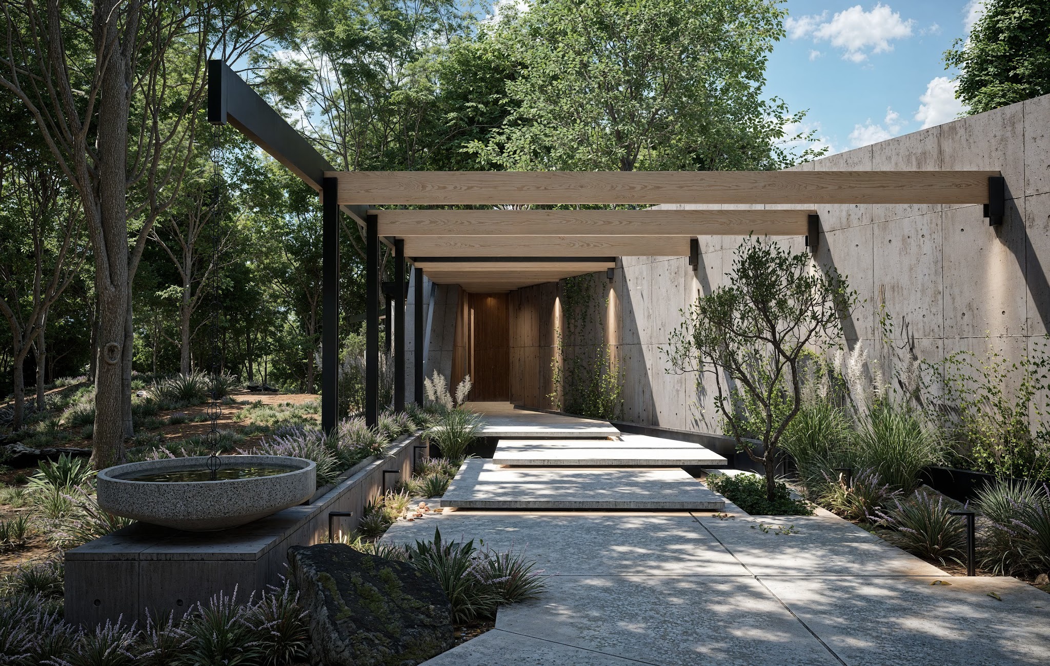 Vegetated roofs and rain chains reinforce this continuity, making natural processes part of the architecture.