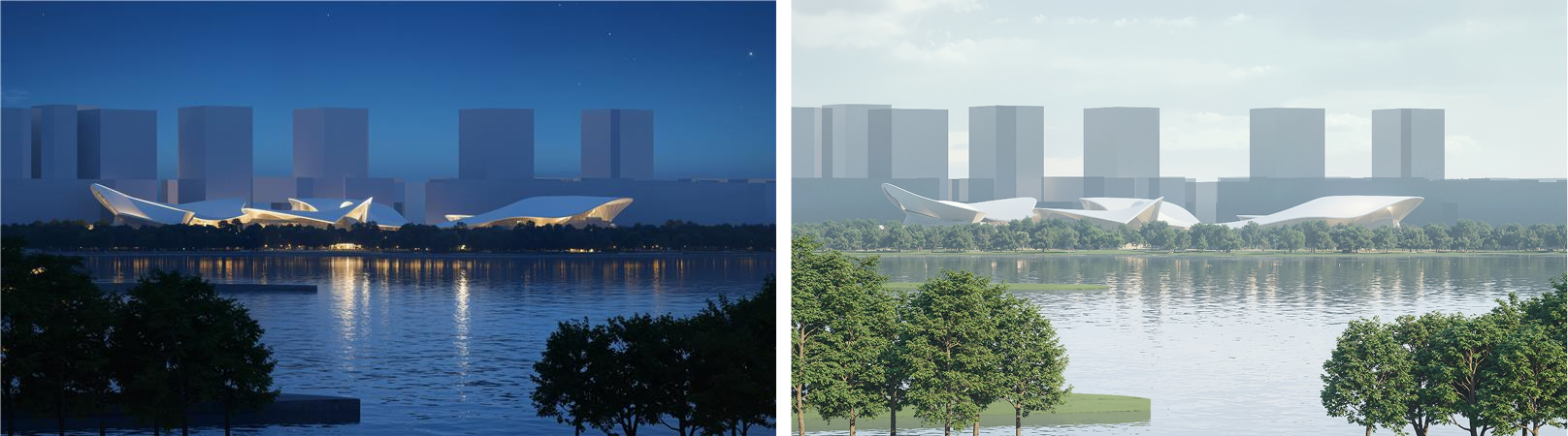 The shift has also expanded how Ennead approaches master planning. Visualization is no longer confined to building-scale representation; it supports district-scale storytelling, contextual testing, and phased development strategies. Atmosphere, material identity, and landscape integration can be explored across larger territories while remaining linked to live design models.