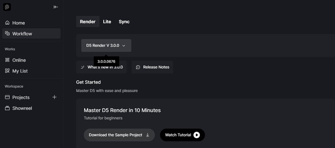 The Workflow tab streamlines productivity by centralizing your entire toolset. Currently integrating D5 Render, D5 Lite, and D5 Sync, it enables one-click access to download, install, and update services. This intuitive layout ensures you spend less time managing software and more time creating.