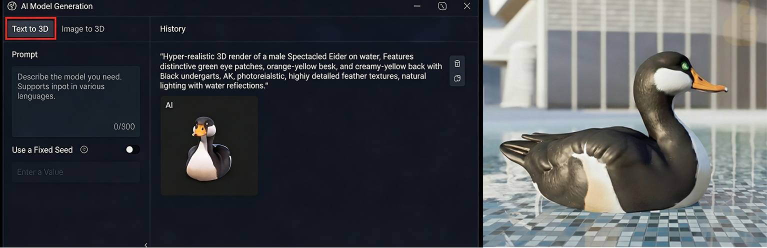 I even tested creating a 3D "Duck" model via text prompt. The result was a high-quality, textured mesh that was ready for the scene. This opens up endless possibilities for custom icons and background details that previously required external modeling.