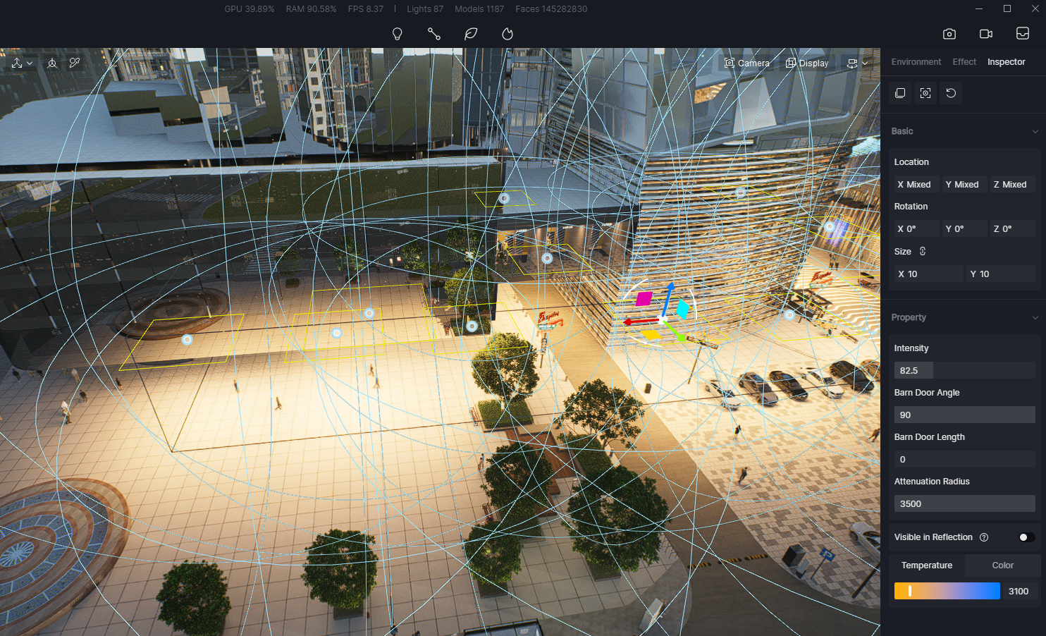After setting the environment and effects for a general atmosphere, we can see that the scene still looks cold and depressing. That's why we need warm lights to breathe life into this commercial building.