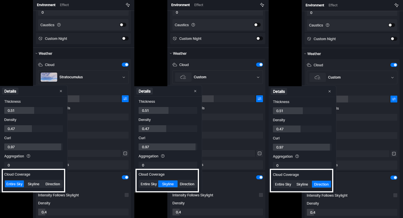 Located just beneath the Presets, the Cloud Layer Control introduces a new system inspired by real-world meteorology. By dividing the atmosphere into three independent tiers—Low, Middle, and Cirrus—it allows you to construct a sophisticated, professional-grade sky. You can now fine-tune each altitude layer individually to perfectly align with the mood and scale of your project.